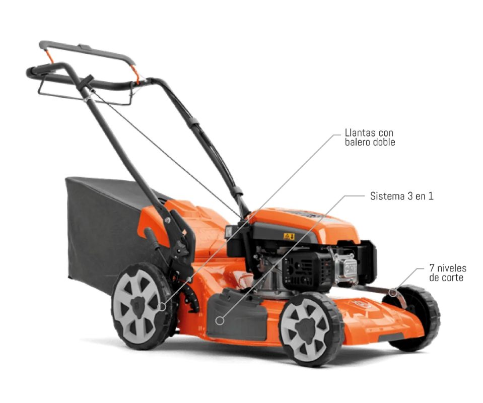 Cuenta con arranque eléctrico, descarga lateral, 5 niveles de altura de corte y luces frontales para mayor visibilidad. Su tanque de combustible de 4.7 L brinda una autonomía adecuada para sesiones de trabajo continuas.