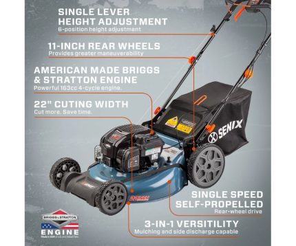 Capacidad de corte: Ancho de 22", plataforma de acero 3 en 1 con funciones de mulching, descarga lateral y embolsado trasero.
