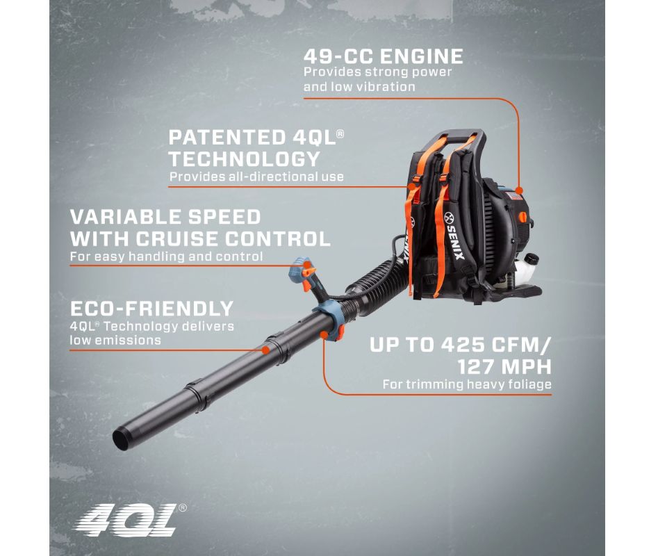 Solicitar cotizaciónLa sopladora tipo mochila 4QL® de 49 cc y 4 tiempos combina potencia, eficiencia y comodidad para trabajos de limpieza intensivos. Su motor con tecnología de lubricación cuantitativa 4QL® ofrece un rendimiento superior, alcanzando hasta 600 CFM y 200 MPH, ideal para despejar grandes áreas con rapidez.